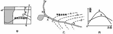 下图中PQ为晨昏线,乙图是甲图中的对应河段及其附近的等潜水位线图,丙图中的年径流量曲线图是乙图中A、E两处测得的,读图回答20-22题。