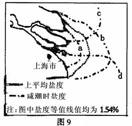 咸潮是发生在内陆淡水河流与海水交界地域的特有水文现象,当内陆河流上游径流水量少于下游的消耗水量时,海水倒灌,造成取水附近水域盐分达到或超过250毫克/升的现象。因为地处长江出海口,上海历来是长江三角洲地区受咸潮危害最严重的城市。读图9回答问题。