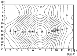 下图为“某地全年逐日逐时平均气温(30年平均)的等温线图”。这种气候图与其它气候图相比较,更能反映与农林生产相关的气温分布实况。回答8-9题。