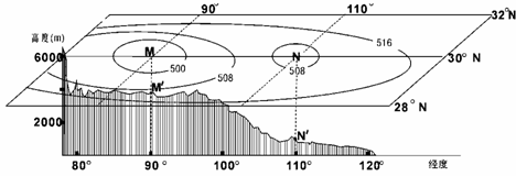 下图阴影部分为沿30oN的部分区域垂直剖面图,平行四边形内为与该区域对应的6000米高空水平面某时等压线(单位:hpa)分布状况。读图回答12-13题。