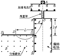 如图所示的装置可测离子的比荷(荷质比)。离子源A产生初速度可忽略不计的正离子,被电压为U0的加速电场加速后匀速通过准直管,然后从O点垂直射入匀强偏转电场,能正好从HM极板上的小孔S射出,立即进入垂直纸面向外的磁感应强度为B的匀强磁场区,最后打在水平放置的底片D1D2的D点(底片右端D1紧靠小孔S)。已知HO=d,HS=2d,DS=L,忽略粒子所受重力。试求