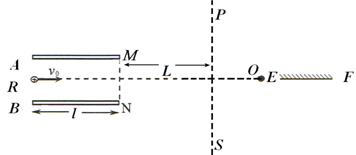 25.(20分)两平行金属板A、B长l=8 cm,两板间距离d=8 cm,A板比B板电势高300 V,即UAB=300V。一带正电的粒子电量q=10-10C,质量m=10-20kg,从R点沿电场中心线垂直电场线飞入电场,初速度v0=2×l06m/s,粒子飞出平行板电场后经过界面MN、PS间的无电场区域后,进入固定在中心线上O点的点电荷Q形成的电场区域(设界面PS右边点电荷的电场分布不受界面的影响。已知两界面MN、PS相距为L= 12 cm,粒子穿过界面PS 最后垂直打在放置于中心线上的荧光屏EF上。求(静电力常数k=9×l09N·m2/C2):