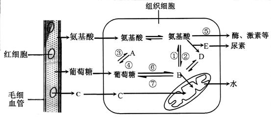 下图为某动物细胞内部分物质代谢示意图,A-E表示物质,①-⑧表示生理过程。