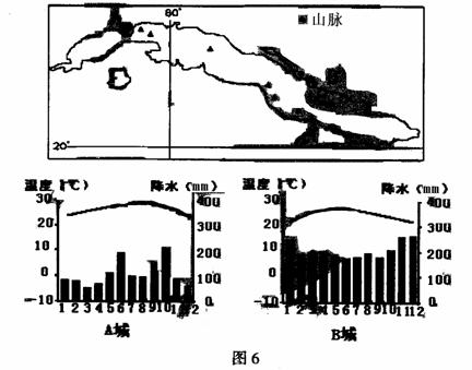 (1)据图6说出A、B两地气候类型成因的差异。(8分)