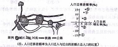 下面为某城市略图和2009年该市各区域人口变动统计图。读图完成1-2题。