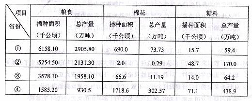 表l为2008年我国四个省份粮食、棉花、糖料作物播种面积及总产量比较,根据所学