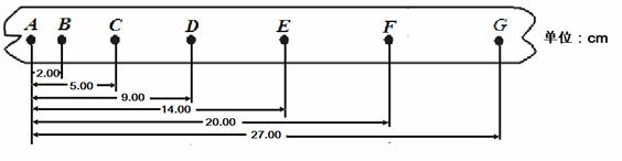 11.(8分)在“探究速度随时间变化的规律”实验中,小车做匀变速直线运动,记录小车运动的纸带如图所示.某同学在纸带上共选择7个计数点A、B、C、D、E、F、G,相邻两个计数点之间还有5个点没有画出,他量得各点到A点的距离如图所示,他根据纸带算出小车的加速度为1 .0m/s2(结果均保留2位有效数字).则: