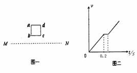 如图一所示,abcd是位于竖直平面内的边长为10cm的正方形闭合金属线框,线框的质量为m=0.02Kg,电阻为R=0.1Ω. 在线框的下方有一匀强磁场区域,MN是匀强磁场区域的水平边界,并与线框的bc边平行,磁场方向与线框平面垂直. 现让线框由距MN的某一高度从静止开始下落,经0.2s开始进入磁场,图二是线框由静止开始下落的速度一时间图象。空气阻力不计,