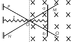 37、如图所示,MN、PQ是相互交叉成60°角的光滑金属导轨,O是它们的交点且接触良好.两导轨处在同一水平面内,并置于有理想边界的匀强磁场中(图中经过O点的虚线即为磁场的左边界).导体棒ab与导轨始终保持良好接触,并在弹簧S的作用下沿导轨以速度v0向左匀速运动.已知在导体棒运动的过程中,弹簧始终处于弹性限度内.磁感应强度的大小为B,方向如图.当导体棒运动到O点时,弹簧恰好处于原长,导轨和导体棒单位长度的电阻均为r,导体棒ab的质量为m.求: