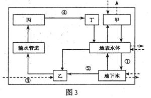 图3为城市水循环示意圈,甲、乙、丙、丁表示用水终端、污水处理厂、大气水、自来水厂,读图回答5-6题。