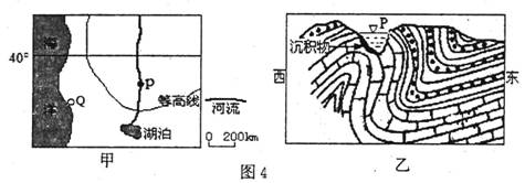 图4中甲为某区域示意图,乙是甲中P地河谷及其附近的地质剖面图,P地河谷剖面的形成与地转偏向力的作用有关。读图回答7-8题。