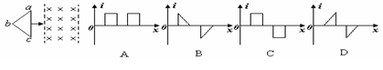 9、有一等腰直角三角形形状的导线框abc,在外力作用下匀速地经过一个宽为d的有限范围的匀强磁场区域,线圈中产生的感应电流i与沿运动方向的位移x之间的函数图象是图中的( )