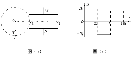 有一电荷量为+q、质量为m的带电粒子,以速率v0从圆周上的P点沿垂直于半径OO1并指向圆心O的方向进入磁场,当从圆周上的O1点飞出磁场时,给M、N板加上如图(b)所示电压u.最后粒子刚好以平行于N板的速度,从N板的边缘飞出.不计平行金属板两端的边缘效应及粒子所受的重力.