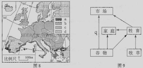 图5、为欧洲四种农业地域类型分布图,图6是该区域某种农业地域类型的经营方式示意图。读图回答8-10题。