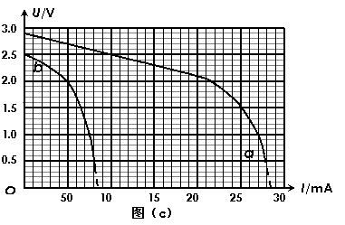 ,见图(c)。由此可知此时该电池的电动势为________V;若调节可调电阻的阻值,使电流小于200mA,则此时电源内阻为________Ω。