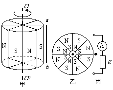 某学习小组设计了一种发电装置如图甲所示,图乙为其俯视图。将8块外形相同的磁铁交错放置组合成一个高h=0.5m、半径r=0.2m的圆柱体,其可绕固定轴OO′逆时针(俯视)转动,角速度ω=100rad/s。设圆柱外侧附近每个磁场区域的磁感应强度大小均为B=0.2T、方向都垂直于圆柱体侧表面。紧靠圆柱体外侧固定一根与其等高、电阻R1=0.5Ω的细金属杆ab,杆与轴OO′平行。图丙中阻值R=1.5Ω的电阻与理想电流表A串联后接在杆a、b两端。下列说法正确的是