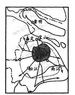 图为上海市21世纪产业沿轴线发展模式图,从市中心向外围依次为中心商务区、第三产业为主的综合功能区、第二、三产业为主的综合功能区,第一、二产业为主的综合功能区。读图分析回答下列问题(8分)