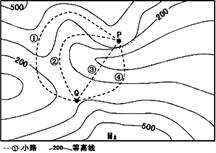 下图是“某地地形简图”,M点位于36.5°N。两中学生分别到达P、M点.测量并计算出两点相对高度是288米。读图回答3-4题。