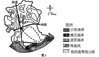 图5为某地级市的市城城镇体系规划示意图。该市沿海有N、D、W三个县城。东邻海岸为沙质岸线,沙软潮平,水质清流,附近有海岛;中部主要为礁石海岸,距海岸500m处水深可达20-25m;西部沿海有大面积的盐田。读后完成7-9题。