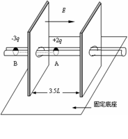 如图所示,沿水平方向放置一条平直光滑槽,它垂直穿过开有小孔的两平行薄板,板相距3.5L。槽内有两个质量均为m的小球A和B,球A带电量为+2q,球B带电量为-3q,两球由长为2L的轻杆相连,组成一带电系统。最初A和B分别静止于左板的两侧,离板的距离均为L。若视小球为质点,不计轻杆的质量,在两板间加上与槽平行向右的匀强电场E后(设槽和轻杆由特殊绝缘材料制成,不影响电场的分布),求:⑴球B刚进入电场时,带电系统的速度大小。⑵带电系统从开始运动到速度第一次为零时球A相对右板的位置。(12分)