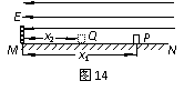 5.(9分)如图14所示,水平光滑绝缘轨道MN的左端有一个固定挡板,轨道所在空间存在E=4.0´102N/C、水平向左的匀强电场。一个质量m=0.10kg、带电荷量q=5.0´10-5C的滑块(可视为质点),从轨道上与挡板相距x1=0.20m的P点由静止释放,滑块在电场力作用下向左做匀加速直线运动。当滑块与挡板碰撞后滑块沿轨道向右做匀减速直线运动,运动到与挡板相距x2=0.10m的Q点,滑块第一次速度减为零。若滑块在运动过程中,电荷量始终保持不变,求: