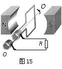 6.(9分)如图15所示,一小型发电机内有n=100匝矩形线圈,线圈面积S=0.10m2,线圈电阻可忽略不计。在外力作用下矩形线圈在B=0.10T匀强磁场中,以恒定的角速度ω=100π rad/s绕垂直于磁场方向的固定轴OO′匀速转动,发电机线圈两端与R =100Ω的电阻构成闭合回路。求: