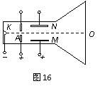 7.(9分)如图16所示为一种测量电子比荷的仪器的原理图,其中阴极K释放电子,阳极A是一个中心开孔的圆形金属板,在AK间加一定的电压。在阳极右侧有一对平行正对带电金属板M、N,板间存在方向竖直向上的匀强电场。O点为荧光屏的正中央位置,且K与O的连线与M、N板间的中心线重合。电子从阴极逸出并被AK间的电场加速后从小孔射出,沿KO连线方向射入M、N两极板间。已知电子从阴极逸出时的初速度、所受的重力及电子之间的相互作用均可忽略不计,在下列过程中,电子均可打到荧光屏上。