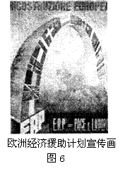 图6是1950年欧洲复兴计划宣传画。下方的等式意思是:欧洲复兴计划=和平十工作。画面上有一座桥梁--由与计划相关的欧洲各国的国旗组成桥梁,连接着美国和 欧洲。对此画寓意的正确理解是