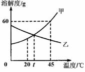 (4分)右图是甲、乙两种固体物质的溶解度曲线。请回答:甲物质在45℃时的溶解度为