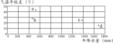 读我国四座城市气温年较差和年降水量坐标图,回答8-9题。
