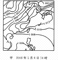 下图是“亚洲东部某区域两个时刻的等压线图”(单位:百帕),读图回答10-11题。