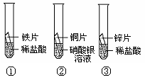 (10分)化学小组为探究铁、铜、锌、银的金属活动性顺序,设计如下三个实验(其中金属均已打磨,其形状、大小及同种稀盐酸的用量均相同):