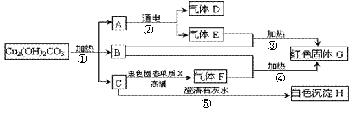 (2)已知铜绿[Cu2(OH)2CO3]在加热时分解生成A、B、C三种常见的氧化物,下面是有关物质之间的转化关系图示。