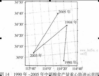 材料三 图14是1990-2005年中国粮食产量重心轨迹示意图。