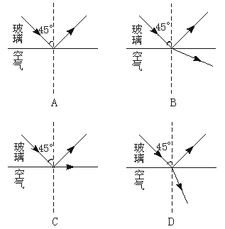 4.(2002年天津高考试题)一束光线从折射率为1.5的玻璃内射向空气,在界面上的入射角为45°.下面四个光路图中,正确的是