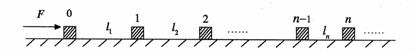 。在所有木块都静止的初始条件下,有一个沿轨道方向水平向右的恒力F持续作用在0号小木块上,使其与后面的木块连接发生碰撞,假如所有碰撞都是完全非弹性的(碰后合为一体共速运动)。求: