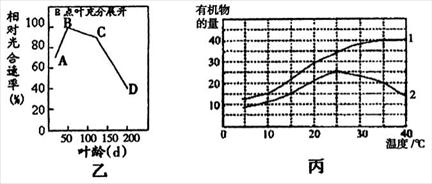26.Ⅰ. (12分)为了提高温室的经济效益,需要调控好温室内的光照、温度、气体和湿度。科研人员对温室栽种的作物进行了相关研究,以下是实验测得的有关数据.(甲表所示为特殊的装置内,给予不同强度的光照,测到的该植物的氧气释放量。乙图表示该作物光合速率(%)与叶龄的关系,A点表示幼叶成折叠状,B点表示叶充分展开。丙图中曲线1、2分别表示作物的实际光合量和净光合量。)