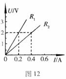 在探究通过电阻的电流跟电阻两端电压的关系时,小明选用了两个定值电阻R1、R2分别做实验,他根据实验数据画出了图12所示的图像。