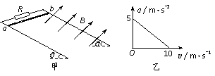 24.(19分)如图甲所示,在一对平行光滑的金属导轨的上端连接一阻值为R=4Ω的定值电阻,两导轨在同一平面内。质量为m=0.1kg,长为L=0.1m的导体棒ab垂直于导轨,使其从靠近电阻处由静止开始下滑,已知导体棒电阻为r=1Ω,整个装置处于垂直于导轨平面的匀强磁场中,导体棒下滑过程中加速度a与速度v的关系如图乙所示。g=10 m / s2。求: