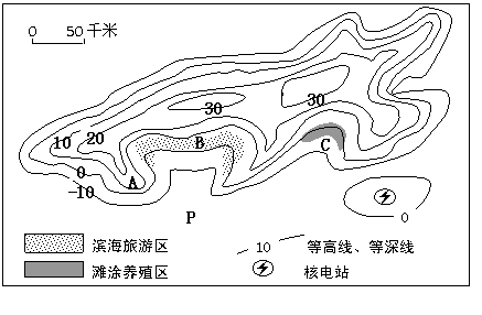 (2)分析C海域发展滩涂养殖的不利因素和B地发展滨海旅游的有利自然条件。(9分)