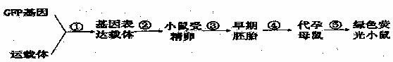 2008年诺贝尔化学奖授予了三位在研究绿色荧光蛋白(GFP)方面做出突出贡献的科学家。绿色荧光蛋白能在蓝光或紫外光的激发下发出荧光,这样借助GFP发出的荧光就可以跟踪蛋白质在细胞内部的移动情况,帮助推断蛋白质的功能。GFP基因可作为目的基因用于培育绿色荧光小鼠,下图表示培育绿色荧光小鼠的基本流程: