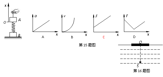 15.质量为m的物体B置于地面 ,通过一劲度系数为k的轻弹簧与物体A相连,开始时A、B都处于静止状态,如图所示.现通过细绳将物体A向上匀加速提升,到B刚要离开地面,下列关于物体A的加速度a、速度v、细绳拉力F与物体A的坐标x关系的图像,正确的是哪一个?假设弹簧一直在弹性限度范围内,以A静止位置为原点,建立方向向上的x轴坐标.
