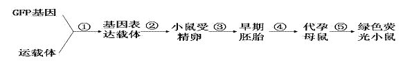 2008年诺贝尔化学奖授予了三位在研究绿色荧光蛋白(GFP)方面做出突出贡献的科学家。绿色荧光蛋白能在蓝光或紫外光的激发下发出荧光,这样借助GFP发出的荧光就可以跟踪蛋白质在细胞内部的移动情况,帮助推断蛋白质的功能。GFP基因可作为目的基因用于培育绿色荧光小鼠,下图表示培育绿色荧光小鼠的基本流程: