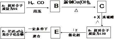 有机物A~F中,A与H2加成得到烷烃,经测定,该烷烃分子中只有两个-CH3,其一卤代物有两种同分异构体,C与X反应生成D。各物质之间的转化关系如图所示:
