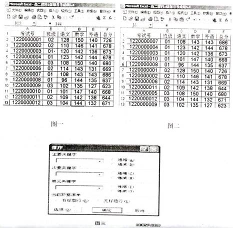 39.(8分)如下列图一所示,为某校学生成绩登记表。如果想分别查看各个班级的总分排名情况,即如下列图二所示,那么显然需要进行排序处理,请根据实际情况填涂图三对话框中的相应位置处。