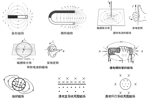 ⑷安培定则(右手螺旋定则):对直导线,四指指磁感线方向;对环行电流,大拇指指中心轴线上的磁感线方向;对长直螺线管大拇指指螺线管内部的磁感线方向。