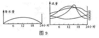 图9为某地降水量与河流径流量日变化示意图,其中最能反映集水区域内植被覆盖良好的流量曲线是 ( )