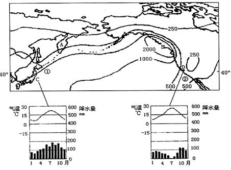 (1)比较图中A、B两地降水量的差异并分析原因。(6分)