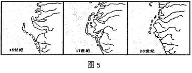 读图5,某大陆海岸变迁示意图,回答16-18题