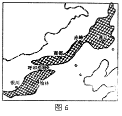 读图6,某地区沙漠化土地分布示意图。据此回答21-23题。